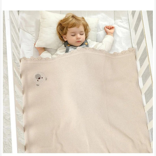 Gestrickte Neugeborenen-Puckdecke – Bärenkopf-Stickerei