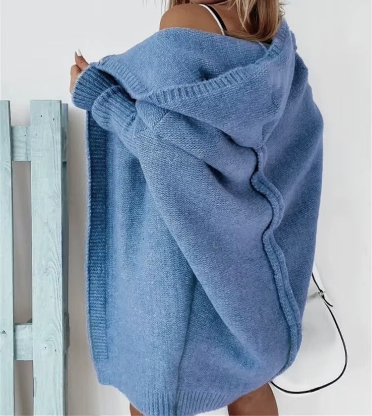 Die Valentina Rossi Strickjacke mit Oversize-Schnitt, großer Kapuze und knielanger Länge bietet gemütliche Wärme ohne Volumen – perfekt zum Überziehen über Loungewear, Denim oder Kleider, zu Hause wie unterwegs.